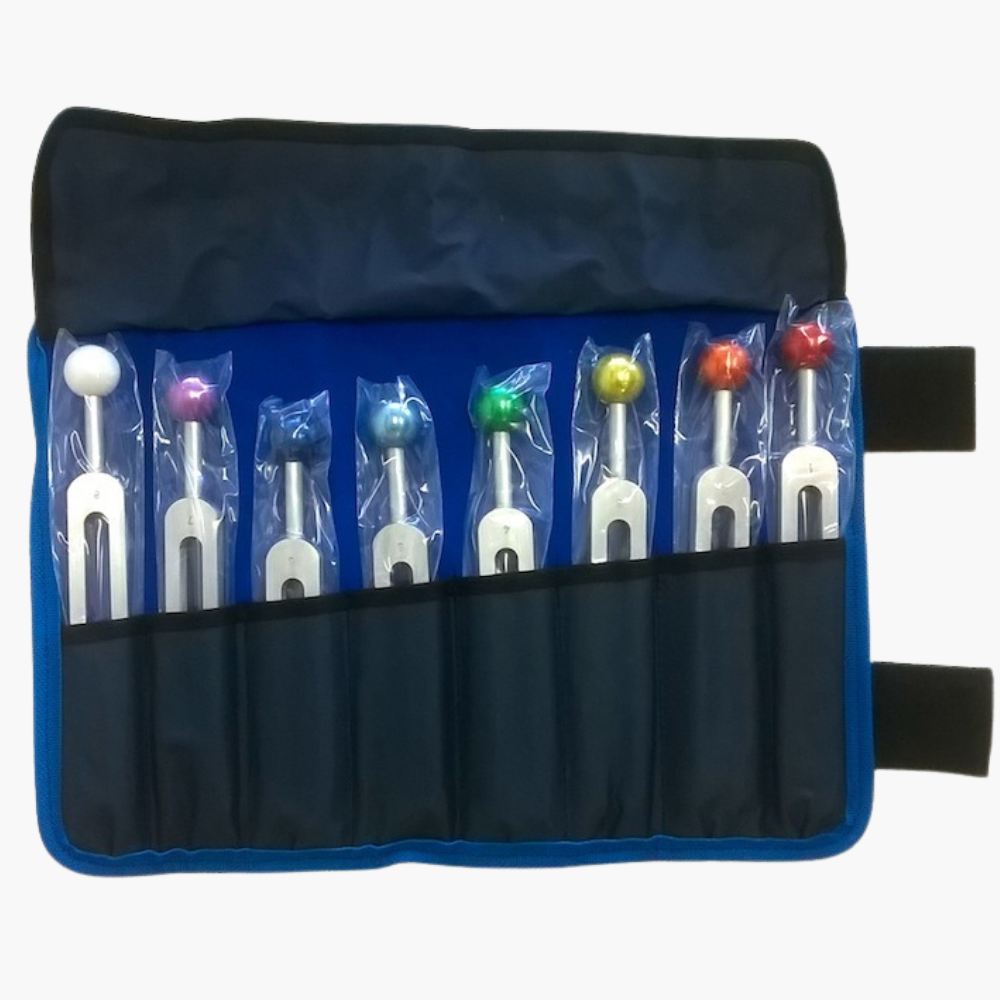 A complete Chakra Sound Set of 8 Tuning Forks, including the 7 traditional chakra frequencies plus an 8th Master Tuning Fork, designed for professional energetic and sound therapy practice.
