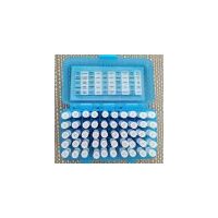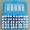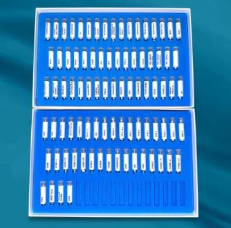 This test kit also comes in a stackable rectangular plastic box where the vials stand upright.